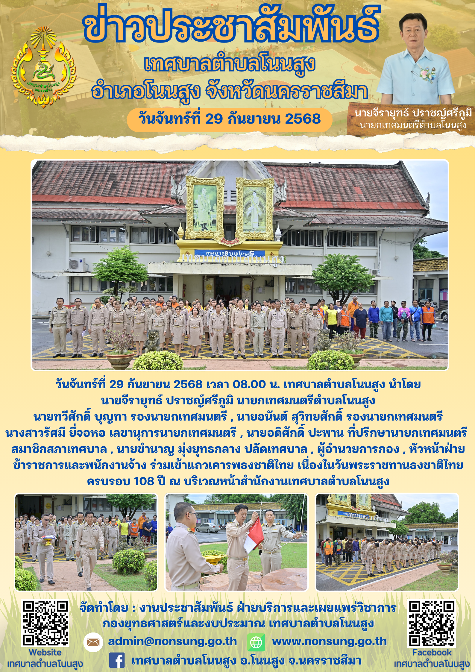 วันจันทร์ที่ 29 กันยายน 2568 เวลา 08.00 น. เทศบาลตำบลโนนสูง นำโดย นายจีรายุฑธ์ ปราชญ์ศรีภูมิ นายกเทศมนตรีตำบลโนนสูง , นายทวีศักดิ์ บุญทา รองนายกเทศมนตรี , นายอนันต์ สุวิทยศักดิ์ รองนายกเทศมนตรี , นางสาวรัศมี ยี่จอหอ เลขานุการนายกเทศมนตรี , นายอดิศักดิ์ ปะพาน ที่ปรึกษานายกเทศมนตรี , สมาชิกสภาเทศบาล , นายชำนาญ มุ่งยุทธกลาง ปลัดเทศบาล , ผู้อำนวยการกอง , หัวหน้าฝ่าย , ข้าราชการและพนักงานจ้าง ร่วมเข้าแถวเคารพธงชาติไทย เนื่องในวันพระราชทานธงชาติไทย ครบรอบ 108 ปี ณ บริเวณหน้าสำนักงานเทศบาลตำบลโนนสูง