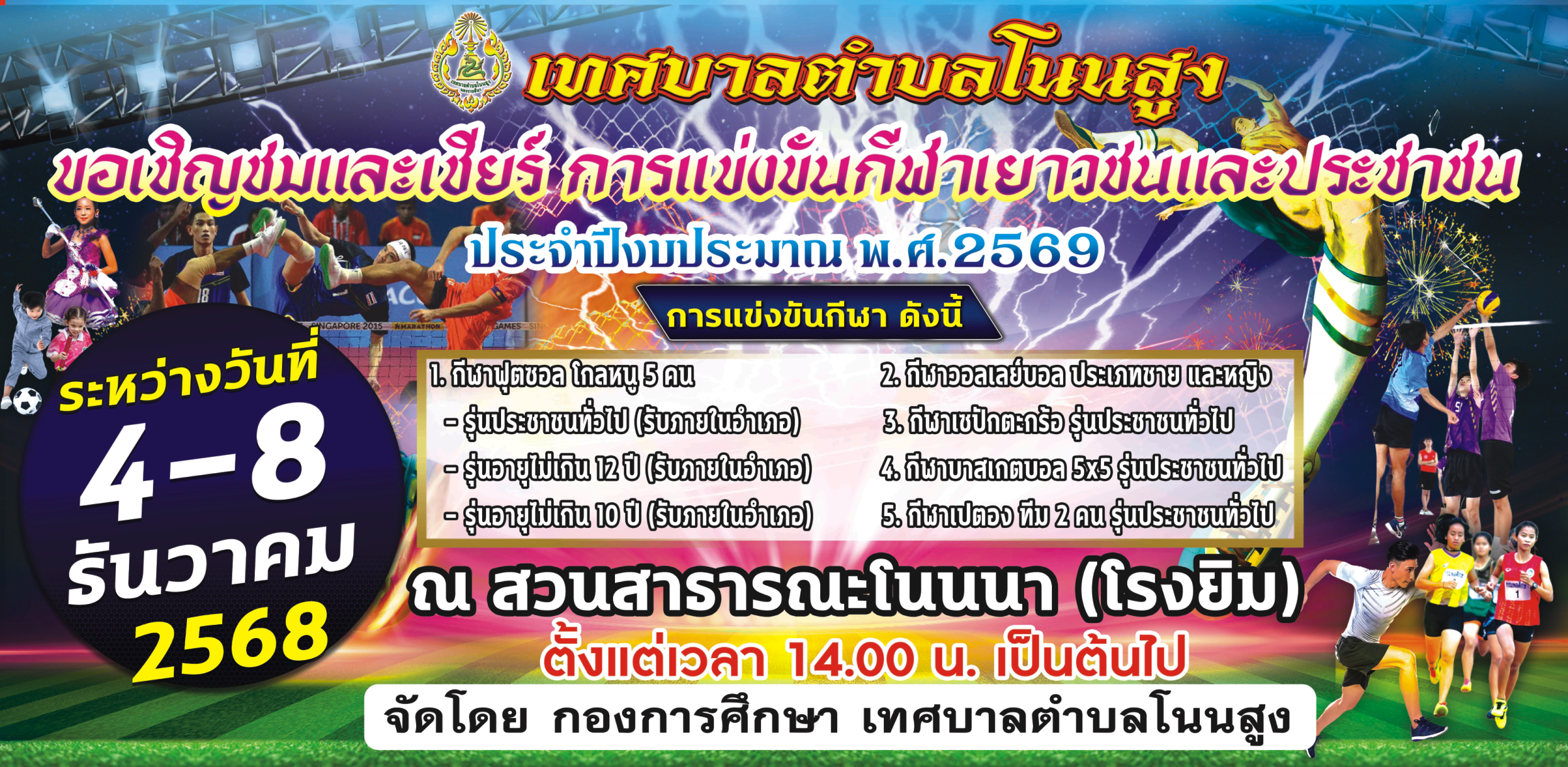 1 เทศบาลตำบลโนนสูง ขอเชิญชมการแข่งขันกีฬาเยาวชนและประชาชน ประจำปีงบประมาณ พ.ศ. 2569 วันที่ 4-8 ธันวาคม 2568 ณ สวนสาธารณะโนนนา เทศบาลตำบลโนนสูง [ 1 ธ.ค. 2568 ]7