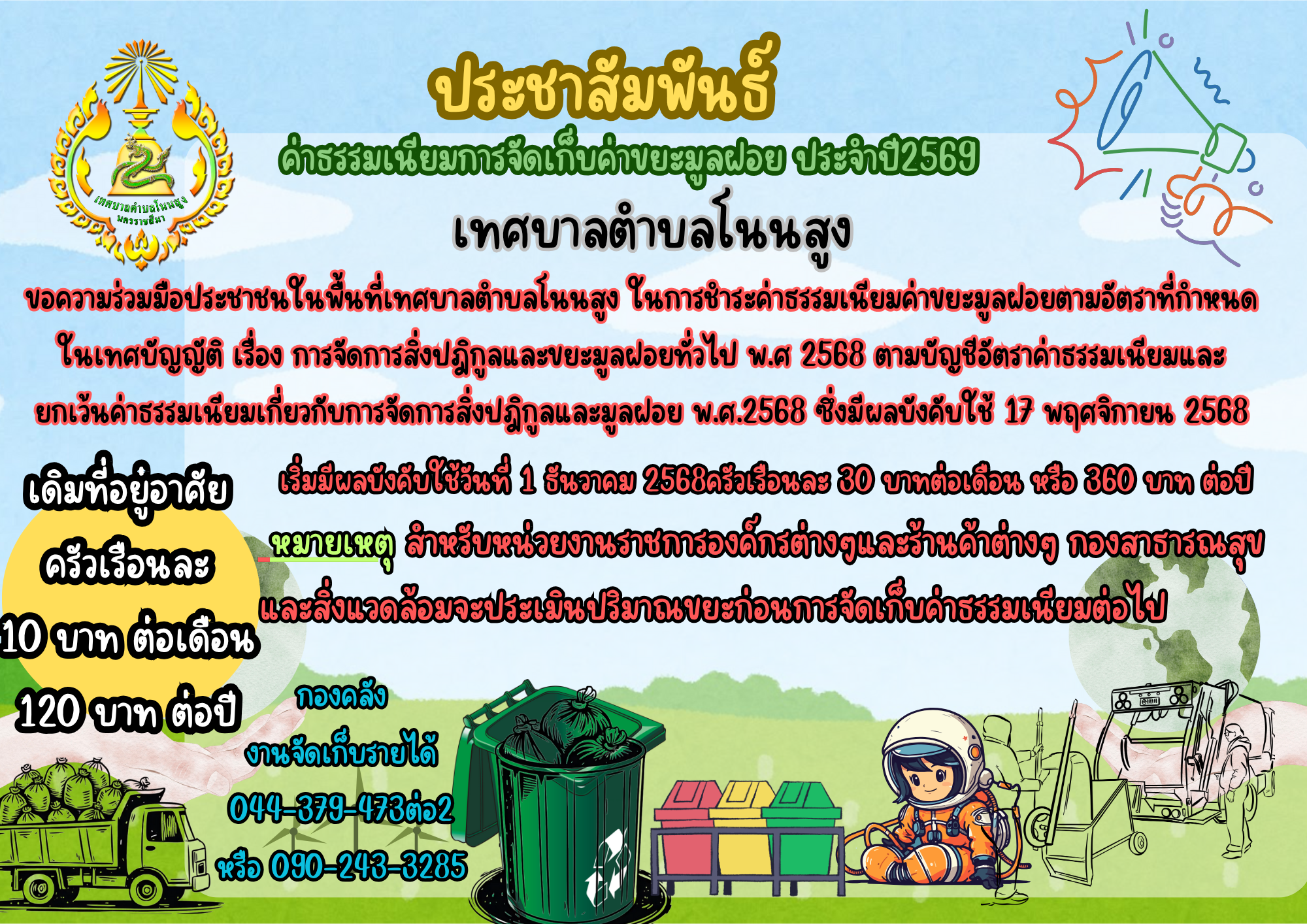 1 ประชาสัมพันธ์จากกองคลังเทศบาลตำบลโนนสูง เรื่อง ค่าธรรมเนียมการจัดเก็บค่าขยะมูลฝอย ประจำปี 2569 [ 14 พ.ย. 2568 ]5