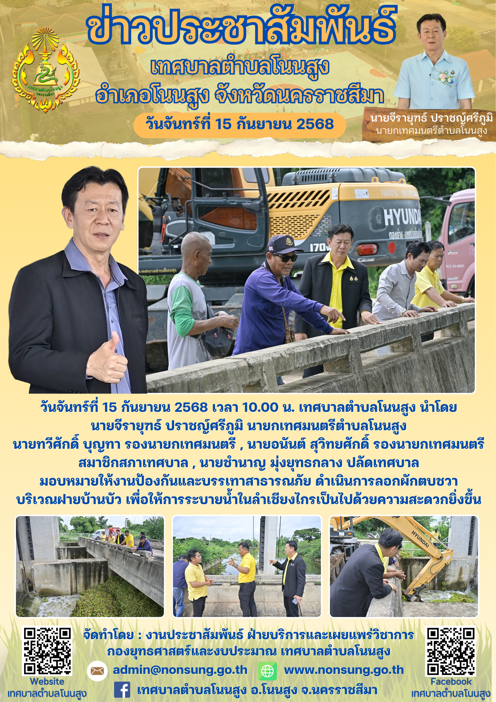 ลงพื้นที่ตรวจสอบ ดำเนินการฉีดน้ำล้างท่ออุดตัน เพื่อระบายน้ำได้ดียิ่งขึ้น ณ วัดโนนหมัน...[วันที่ 2025-09-09][ผู้อ่าน 1]