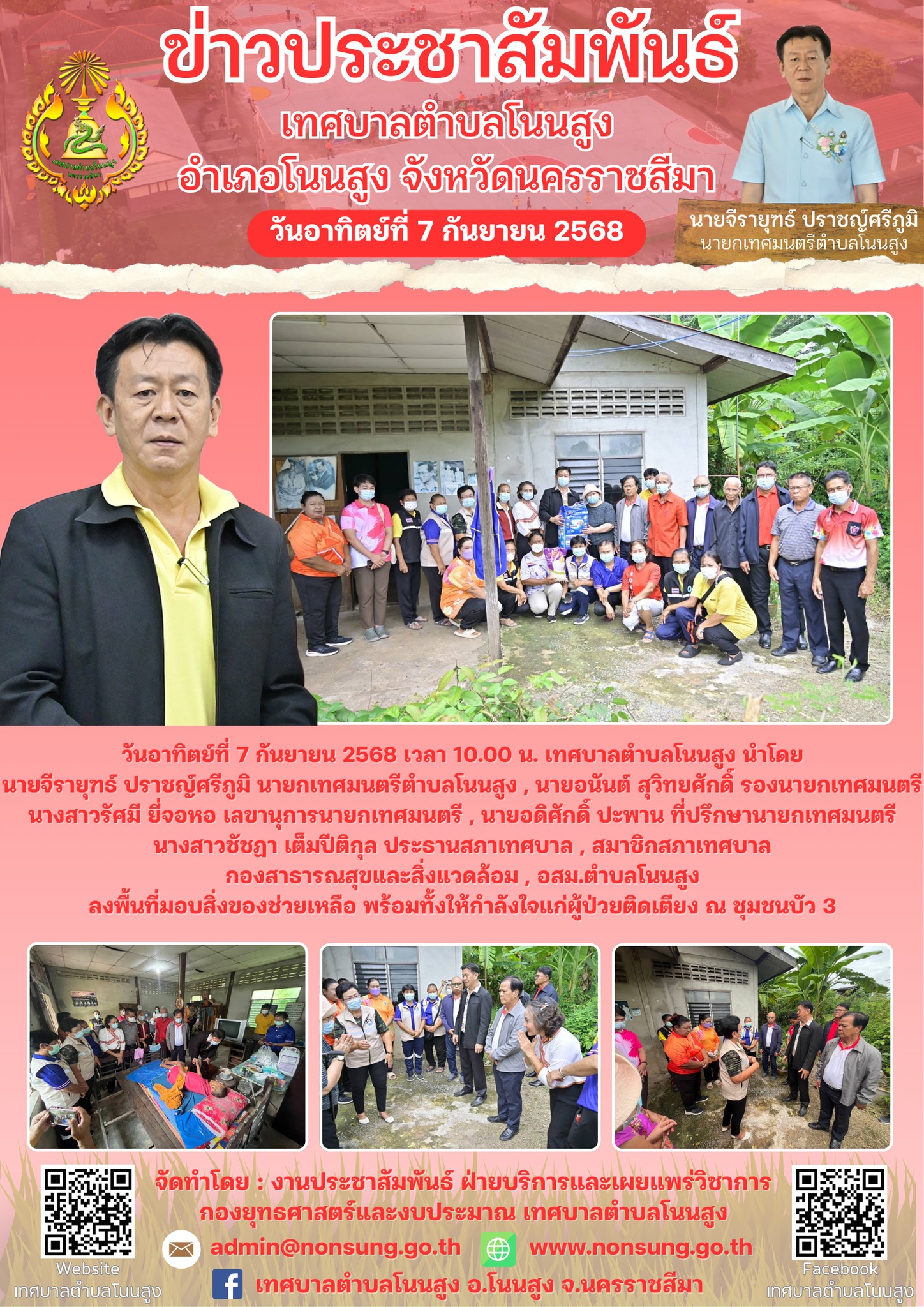 ลงพื้นที่มอบสิ่งของช่วยเหลือ พร้อมทั้งให้กำลังใจแก่ผู้ป่วยติดเตียง ณ ชุมชนบัว 3...[วันที่ 2025-09-07][ผู้อ่าน 0]