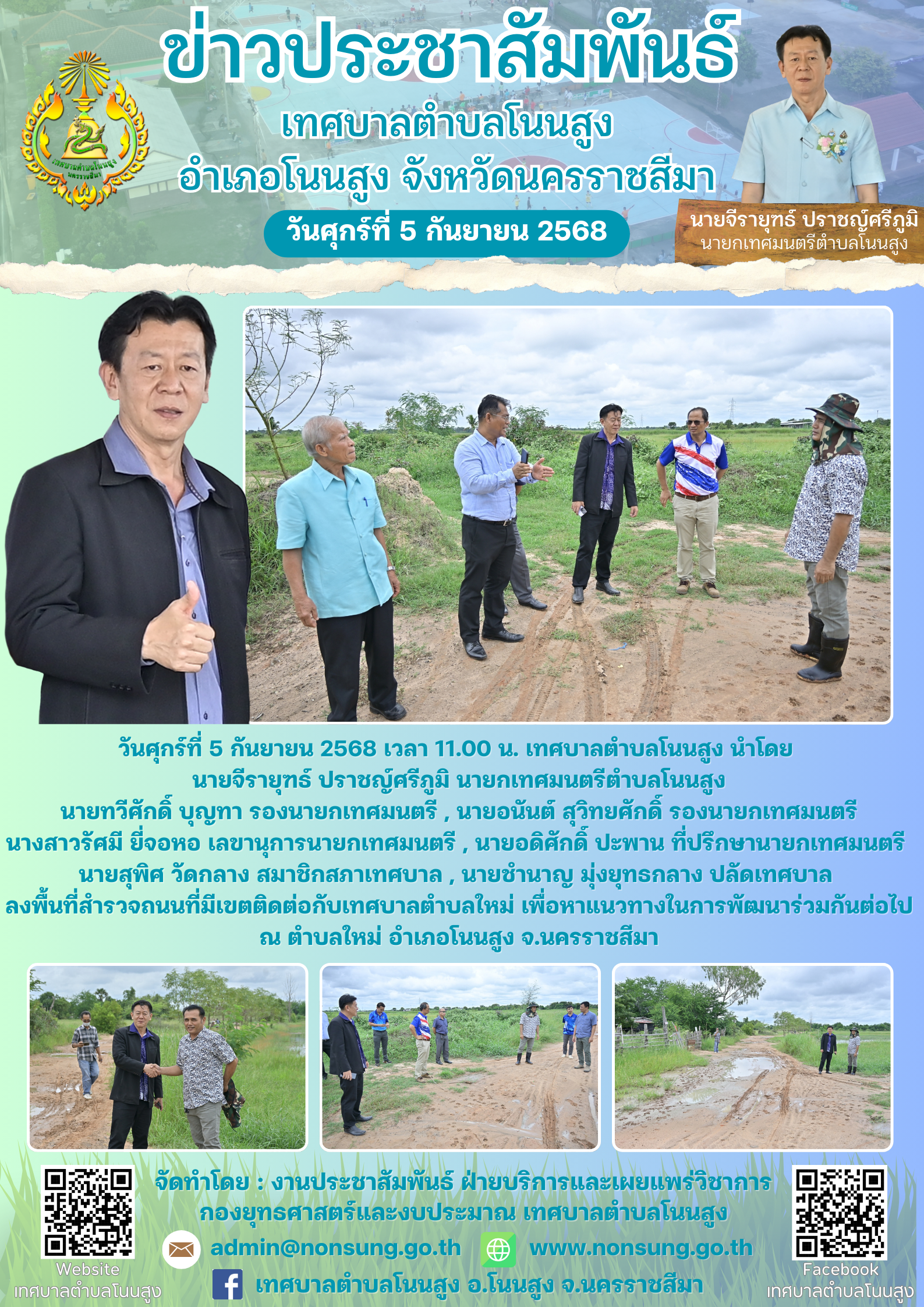 ลงพื้นที่สำรวจถนนที่มีเขตติดต่อกับเทศบาลตำบลใหม่ โดยได้รับความร่วมมือจาก นายสมัย บุตรกลาง นายกเทศมนตรี�...[วันที่ 2025-09-05][ผู้อ่าน 0]