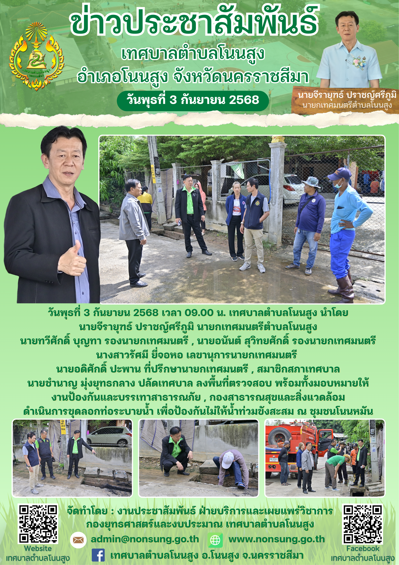 วันพุธที่ 3 กันยายน 2568 เวลา 09.00 น. เทศบาลตำบลโนนสูง นำโดย นายจีรายุฑธ์ ปราชญ์ศรีภูมิ นายกเทศมนตรีตำบลโนนสูง , นายทวีศักดิ์ บุญทา รองนายกเทศมนตรี , นายอนันต์ สุวิทยศักดิ์ รองนายกเทศมนตรี , นางสาวรัศมี ยี่จอหอ เลขานุการนายกเทศมนตรี , นายอดิศักดิ์ ปะพาน ที่ปรึกษานายกเทศมนตรี , สมาชิกสภาเทศบาล , นายชำนาญ มุ่งยุทธกลาง ปลัดเทศบาล ลงพื้นที่ตรวจสอบ พร้อมทั้งมอบหมายให้งานป้องกันและบรรเทาสาธารณภัย , กองสาธารณสุขและสิ่งแวดล้อม ดำเนินการขุดลอกท่อระบายน้ำ เพื่อป้องกันไม่ให้น้ำท่วมขังสะสม ณ ชุมชนโนนหมัน