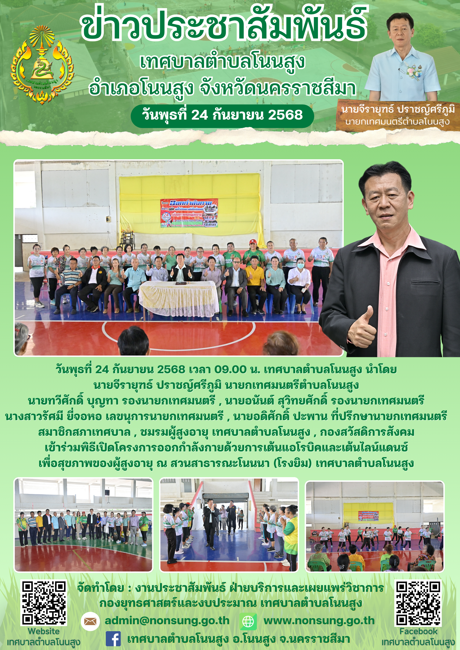 วันพุธที่ 24 กันยายน 2568 เวลา 09.00 น. เทศบาลตำบลโนนสูง นำโดย นายจีรายุฑธ์ ปราชญ์ศรีภูมิ นายกเทศมนตรีตำบลโนนสูง , นายทวีศักดิ์ บุญทา รองนายกเทศมนตรี , นายอนันต์ สุวิทยศักดิ์ รองนายกเทศมนตรี , นางสาวรัศมี ยี่จอหอ เลขนุการนายกเทศมนตรี , นายอดิศักดิ์ ปะพาน ที่ปรึกษานายกเทศมนตรี , สมาชิกสภาเทศบาล , ชมรมผู้สูงอายุ เทศบาลตำบลโนนสูง , กองสวัสดิการสังคม เข้าร่วมพิธีเปิดโครงการออกกำลังกายด้วยการเต้นแอโรบิคและเต้นไลน์แดนซ์ เพื่อสุขภาพของผู้สูงอายุ ณ สวนสาธารณะโนนนา (โรงยิม) เทศบาลตำบลโนนสูง