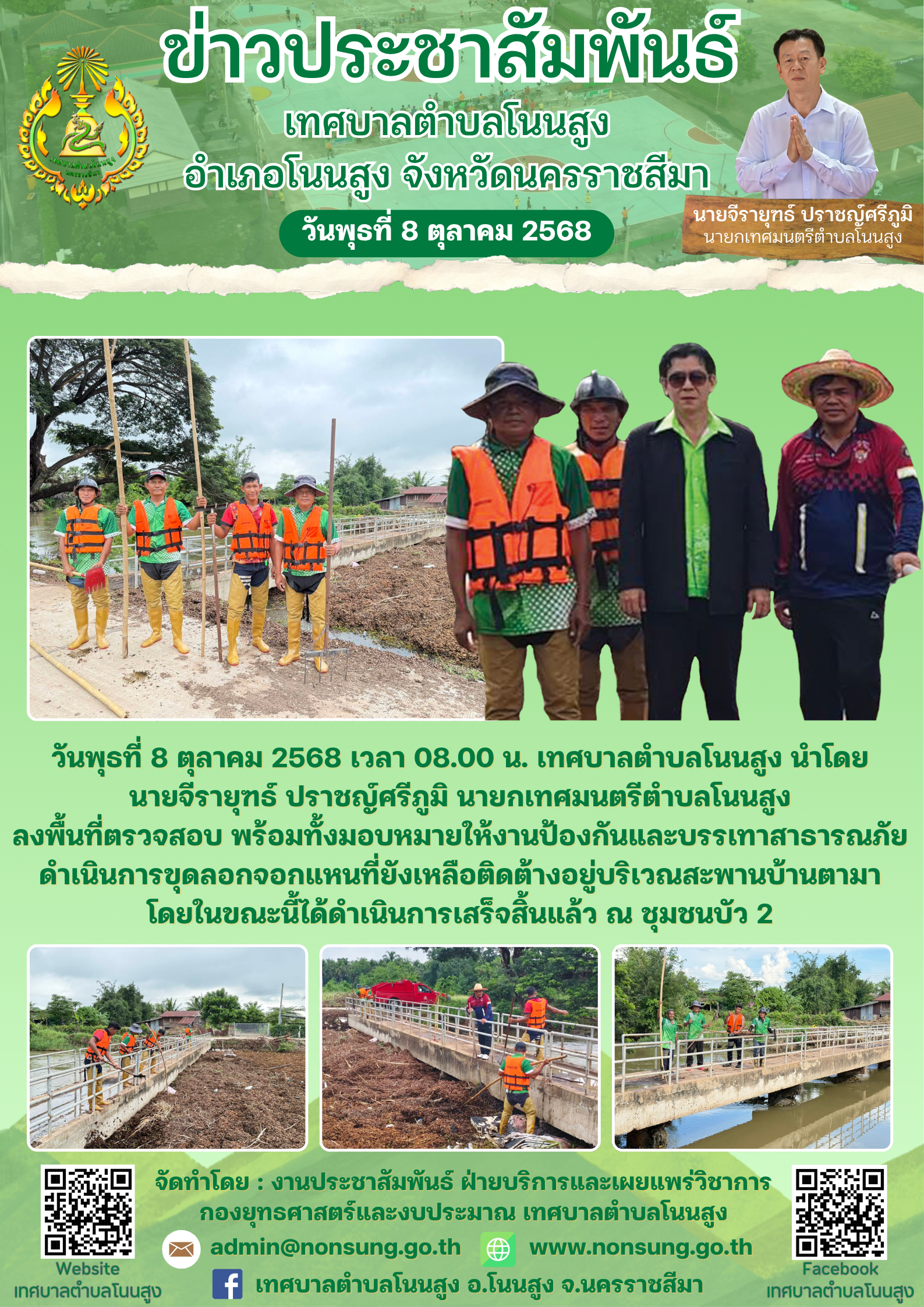 วันพุธที่ 8 ตุลาคม 2568 เวลา 08.00 น. เทศบาลตำบลโนนสูง นำโดย นายจีรายุฑธ์ ปราชญ์ศรีภูมิ นายกเทศมนตรีตำบลโนนสูง ลงพื้นที่ตรวจสอบ พร้อมทั้งมอบหมายให้งานป้องกันและบรรเทาสาธารณภัย ดำเนินการขุดลอกจอกแหนที่ยังเหลือติดต้างอยู่บริเวณสะพานบ้านตามา โดยในขณะนี้ได้ดำเนินการเสร็จสิ้นแล้ว ณ ชุมชนบัว 2