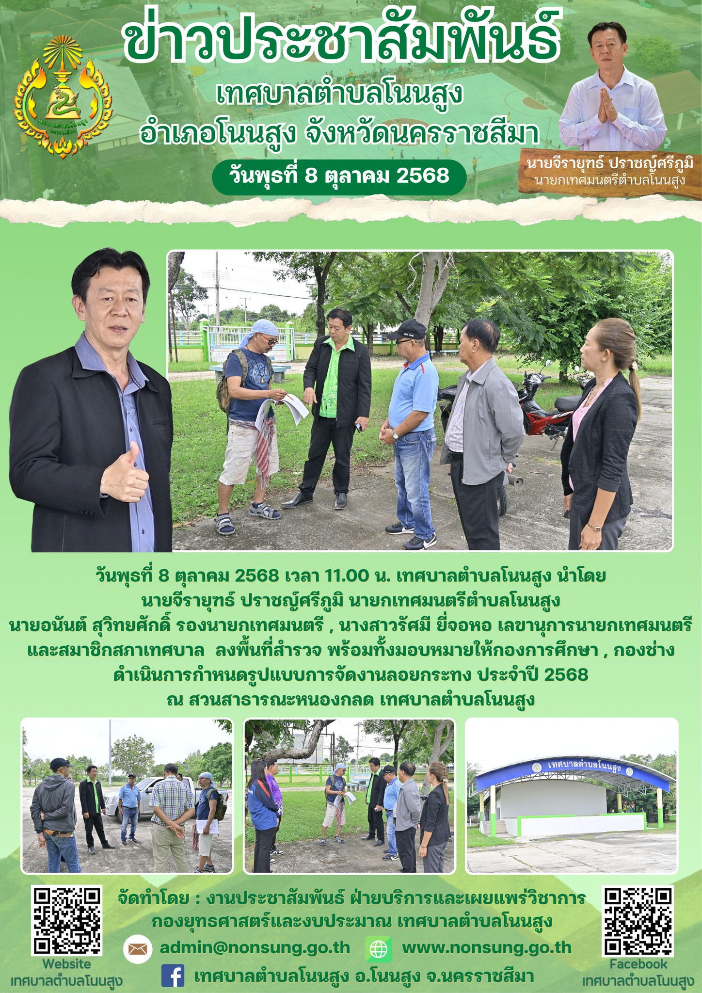 วันพุธที่ 8 ตุลาคม 2568 เวลา 11.00 น. เทศบาลตำบลโนนสูง นำโดย นายจีรายุฑธ์ ปราชญ์ศรีภูมิ นายกเทศมนตรีตำบลโนนสูง , นายอนันต์ สุวิทยศักดิ์ รองนายกเทศมนตรี , นางสาวรัศมี ยี่จอหอ เลขานุการนายกเทศมนตรี และสมาชิกสภาเทศบาล ลงพื้นที่สำรวจ พร้อมทั้งมอบหมายให้กองการศึกษา , กองช่าง ดำเนินการกำหนดรูปแบบการจัดงานลอยกระทง ประจำปี 2568 ณ สวนสาธารณะหนองกลด เทศบาลตำบลโนนสูง
