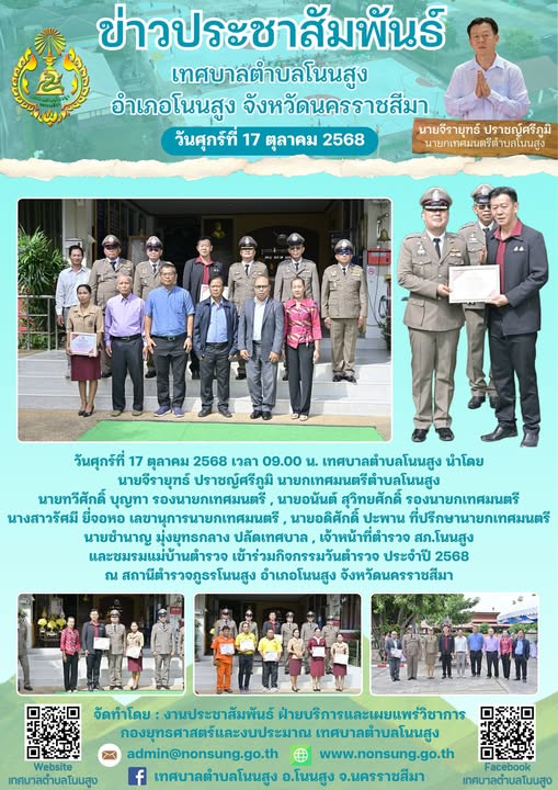 วันศุกร์ที่ 17 ตุลาคม 2568 เวลา 09.00 น. เทศบาลตำบลโนนสูง นำโดย นายจีรายุฑธ์ ปราชญ์ศรีภูมิ นายกเทศมนตรีตำบลโนนสูง , นายทวีศักดิ์ บุญทา รองนายกเทศมนตรี , นายอนันต์ สุวิทยศักดิ์ รองนายกเทศมนตรี , นางสาวรัศมี ยี่จอหอ เลขานุการนายกเทศมนตรี , นายอดิศักดิ์ ปะพาน ที่ปรึกษานายกเทศมนตรี , นายชำนาญ มุ่งยุทธกลาง ปลัดเทศบาล , เจ้าหน้าที่ตำรวจ สภ.โนนสูง และชมรมแม่บ้านตำรวจ เข้าร่วมกิจกรรมวันตำรวจ ประจำปี 2568 ณ สถานีตำรวจภูธรโนนสูง อำเภอโนนสูง จังหวัดนครราชสีมา