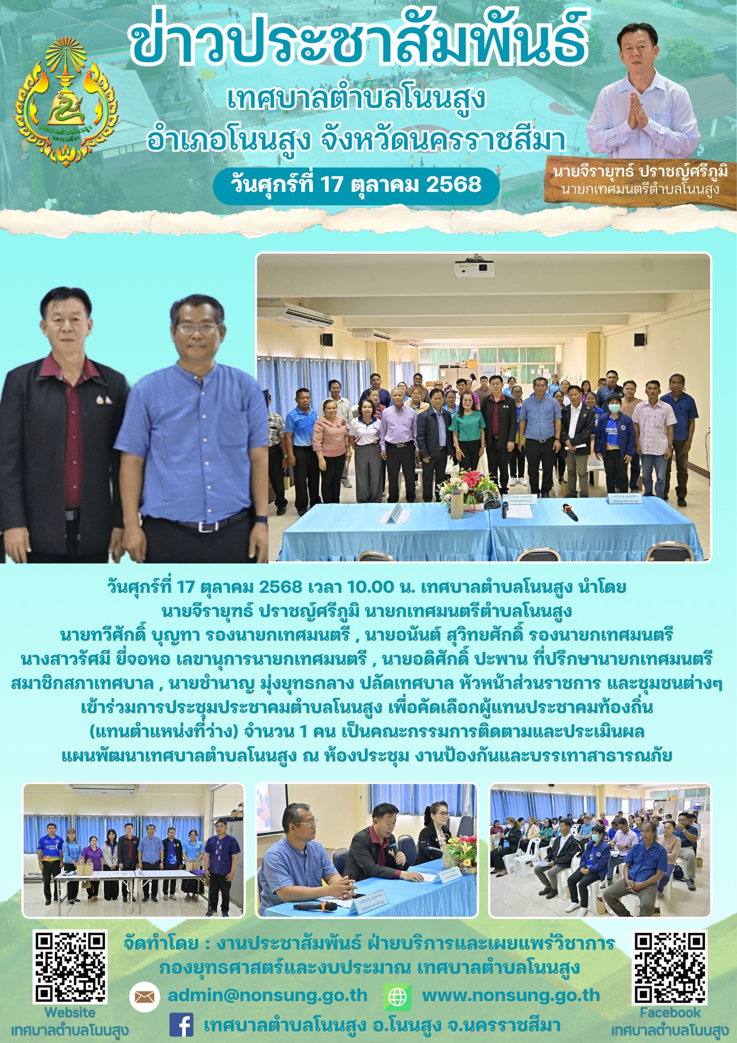 วันศุกร์ที่ 17 ตุลาคม 2568 เวลา 10.00 น. เทศบาลตำบลโนนสูง นำโดย นายจีรายุฑธ์ ปราชญ์ศรีภูมิ นายกเทศมนตรีตำบลโนนสูง , นายทวีศักดิ์ บุญทา รองนายกเทศมนตรี , นายอนันต์ สุวิทยศักดิ์ รองนายกเทศมนตรี , นางสาวรัศมี ยี่จอหอ เลขานุการนายกเทศมนตรี , นายอดิศักดิ์ ปะพาน ที่ปรึกษานายกเทศมนตรี , สมาชิกสภาเทศบาล , นายชำนาญ มุ่งยุทธกลาง ปลัดเทศบาล , หัวหน้าส่วนราชการ และชุมชนต่างๆ เข้าร่วมการประชุมประชาคมตำบลโนนสูง เพื่อคัดเลือกผู้แทนประชาคมท้องถิ่น (แทนตำแหน่งที่ว่าง) จำนวน 1 คน เป็นคณะกรรมการติดตามและประเมินผล แผนพัฒนาเทศบาลตำบลโนนสูง ณ ห้องประชุม งานป้องกันและบรรเทาสาธารณภัย