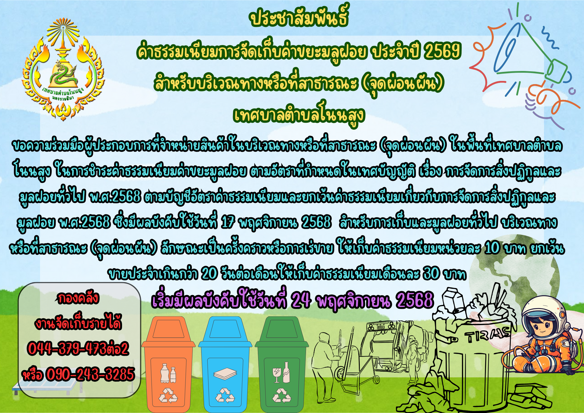 2 ประชาสัมพันธ์จากกองคลังเทศบาลตำบลโนนสูง เรื่อง ค่าธรรมเนียมการจัดเก็บค่าขยะมูลฝอย ประจำปี 2569 สำหรับบริเวณทางหรือที่สาธารณะ (จุดผ่อนผัน) [ 14 พ.ย. 2568 ]3