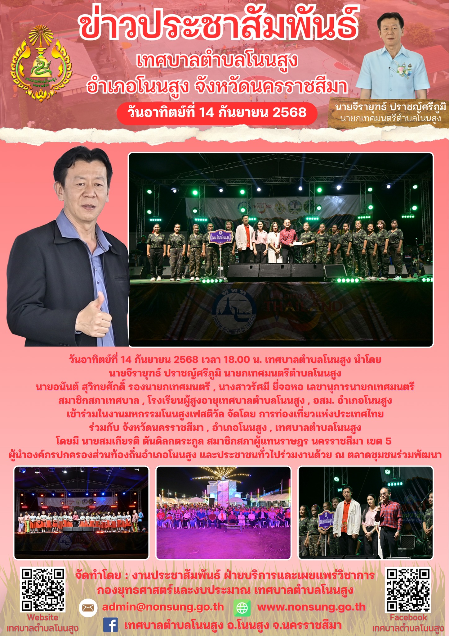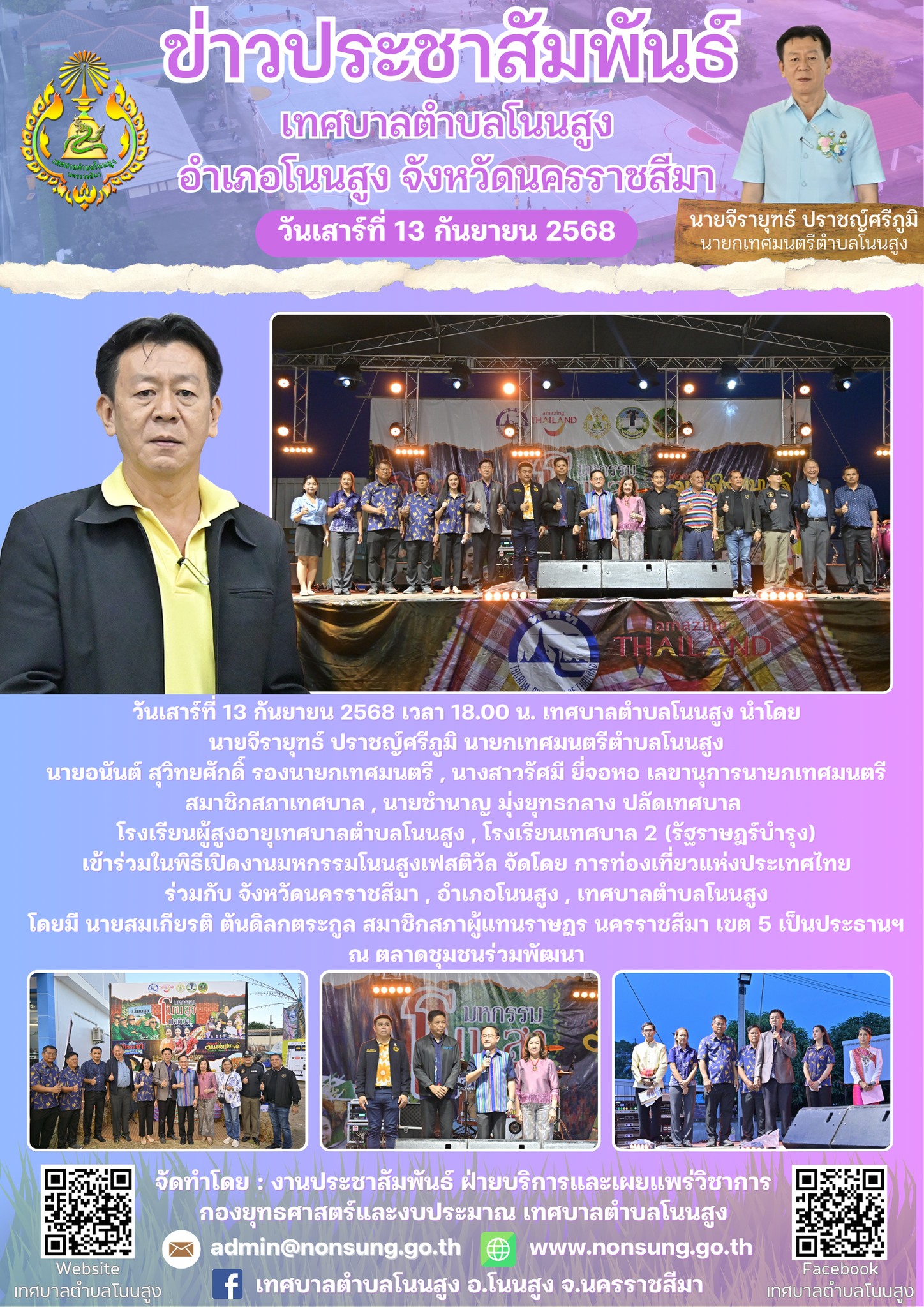 พิธีเปิดงานมหกรรมโนนสูงเฟสติวัล ณ ตลาดชุมชนร่วมพัฒนา...[วันที่ 2025-09-13][ผู้อ่าน 0]