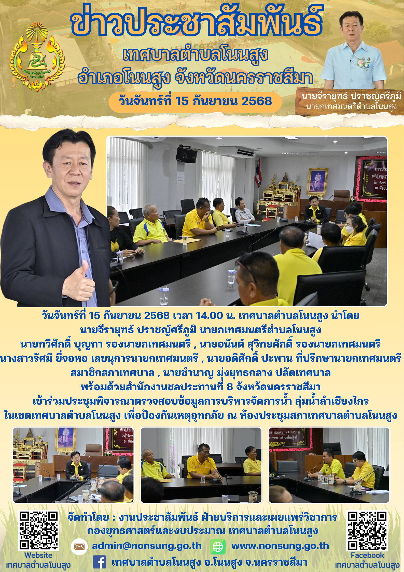ประชุมพิจารณาตรวจสอบข้อมูลการบริหารจัดการน้ำ ลุ่มน้ำลำเชียงไกร ในเขตเทศบาลตำบลโนนสูง...[วันที่ 2025-09-15][ผู้อ่าน 0]