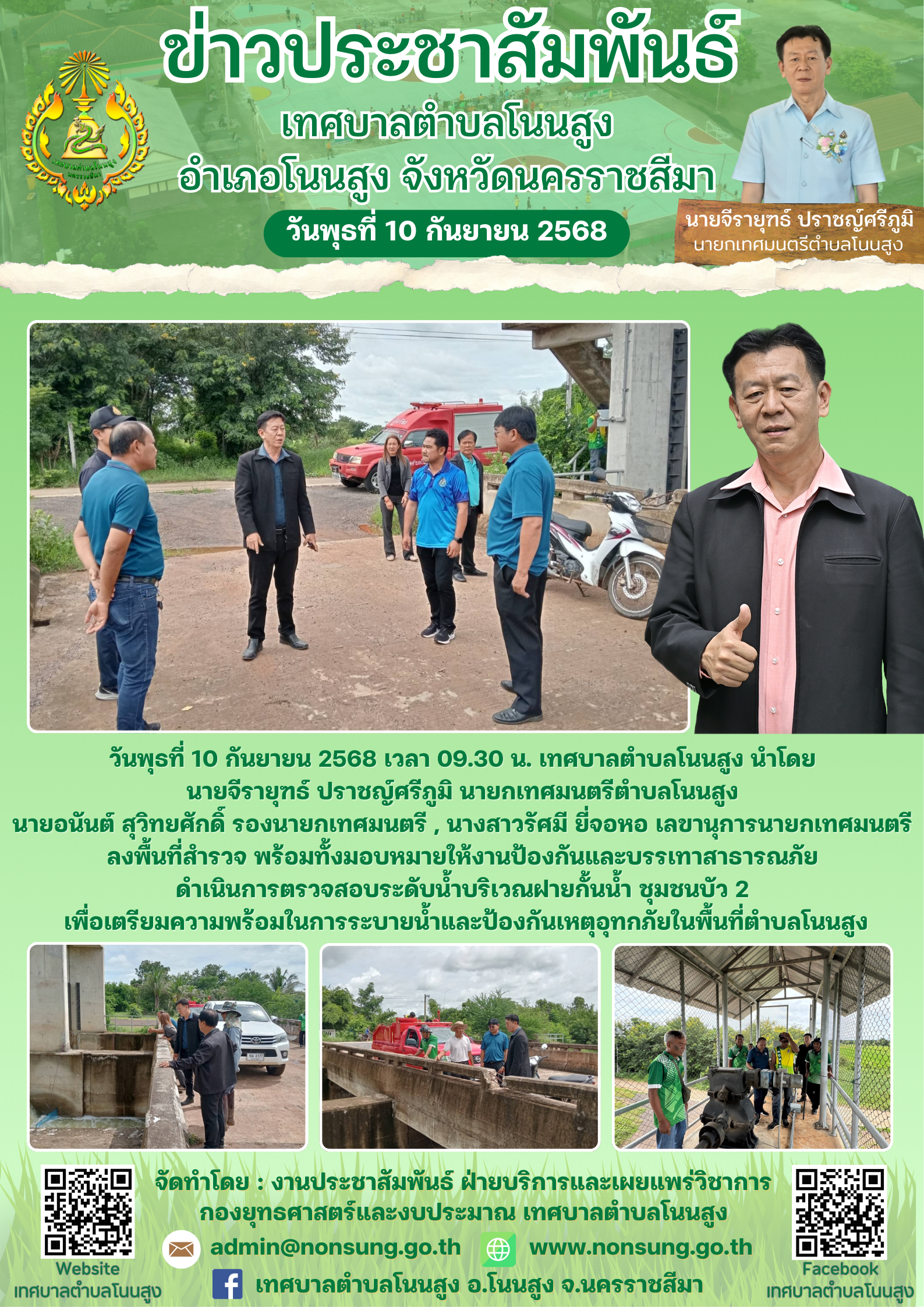 ตรวจสอบระดับน้ำบริเวณฝายกั้นน้ำ ชุมชนบัว 2 เพื่อเตรียมความพร้อมในการระบายน้ำและป้องกันเหตุอุทกภัยในพื้�...[วันที่ 2025-09-10][ผู้อ่าน 0]