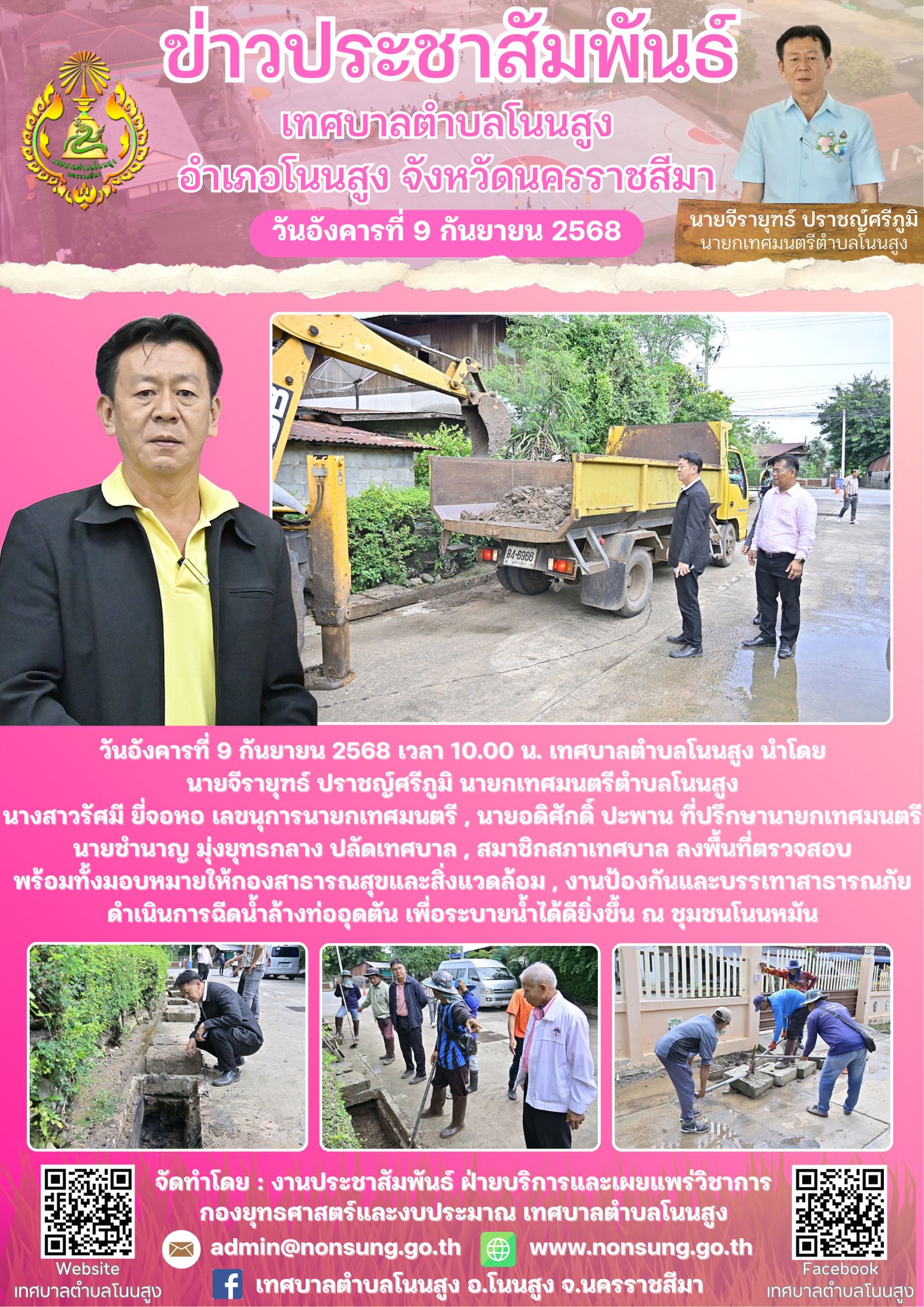 ลงพื้นที่ตรวจสอบ ดำเนินการฉีดน้ำล้างท่ออุดตัน เพื่อระบายน้ำได้ดียิ่งขึ้น ณ วัดโนนหมัน...[วันที่ 2025-09-09][ผู้อ่าน 0]