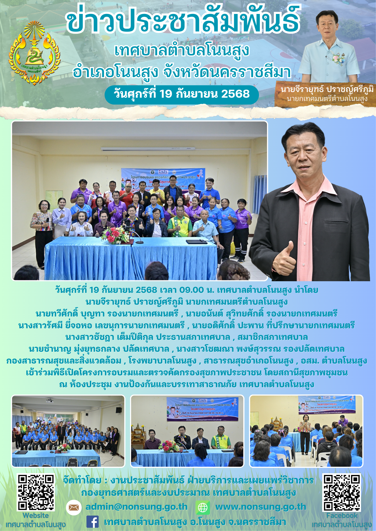 วันศุกร์ที่ 19 กันยายน 2568 เวลา 09.00 น. เทศบาลตำบลโนนสูง นำโดย นายจีรายุฑธ์ ปราชญ์ศรีภูมิ นายกเทศมนตรีตำบลโนนสูง , นายทวีศักดิ์ บุญทา รองนายกเทศมนตรี , นายอนันต์ สุวิทยศักดิ์ รองนายกเทศมนตรี , นางสาวรัศมี ยี่จอหอ เลขนุการนายกเทศมนตรี , นายอดิศักดิ์ ปะพาน ที่ปรึกษานายกเทศมนตรี , นางสาวชัชฎา เต็มปีติกุล ประธานสภาเทศบาล , สมาชิกสภาเทศบาล , นายชำนาญ มุ่งยุทธกลาง ปลัดเทศบาล , นางสาวโชฒณา พงษ์สุวรรณ รองปลัดเทศบาล กองสาธารณสุขและสิ่งแวดล้อม , โรงพยาบาลโนนสูง , สาธารณสุขอำเภอโนนสูง , อสม. ตำบลโนนสูง เข้าร่วมพิธีเปิดโครงการอบรมและตรวจคัดกรองสุขภาพประชาชน โดยสถานีสุขภาพชุมชน ณ ห้องประชุม งานป้องกันและบรรเทาสาธาณภัย เทศบาลตำบลโนนสูง