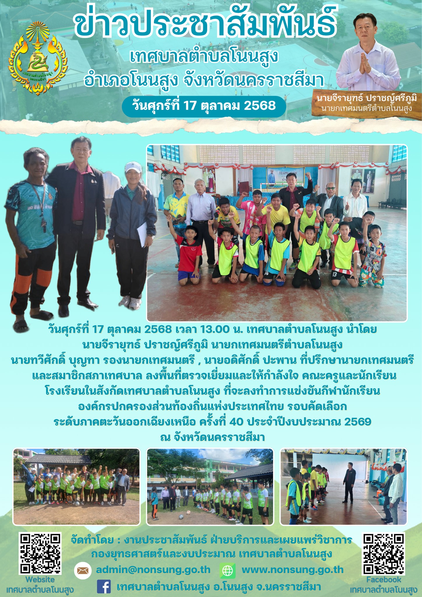 วันศุกร์ที่ 17 ตุลาคม 2568 เวลา 13.00 น. เทศบาลตำบลโนนสูง นำโดย นายจีรายุฑธ์ ปราชญ์ศรีภูมิ นายกเทศมนตรีตำบลโนนสูง , นายทวีศักดิ์ บุญทา รองนายกเทศมนตรี , นายอดิศักดิ์ ปะพาน ที่ปรึกษานายกเทศมนตรี และสมาชิกสภาเทศบาล ลงพื้นที่ตรวจเยี่ยมและให้กำลังใจ คณะครูและนักเรียน โรงเรียนในสังกัดเทศบาลตำบลโนนสูง ที่จะลงทำการแข่งขันกีฬานักเรียน องค์กรปกครองส่วนท้องถิ่นแห่งประเทศไทย รอบคัดเลือก ระดับภาคตะวันออกเฉียงเหนือ ครั้งที่ 40 ประจำปีงบประมาณ 2569 ณ จังหวัดนครราชสีมา